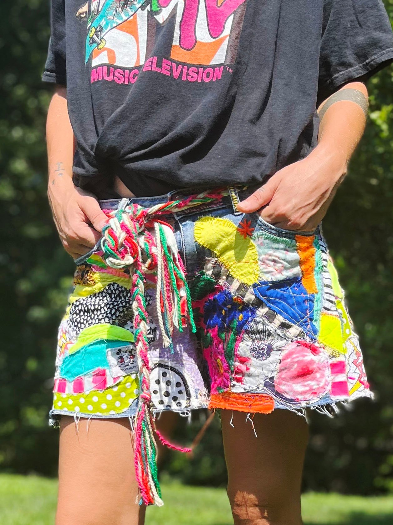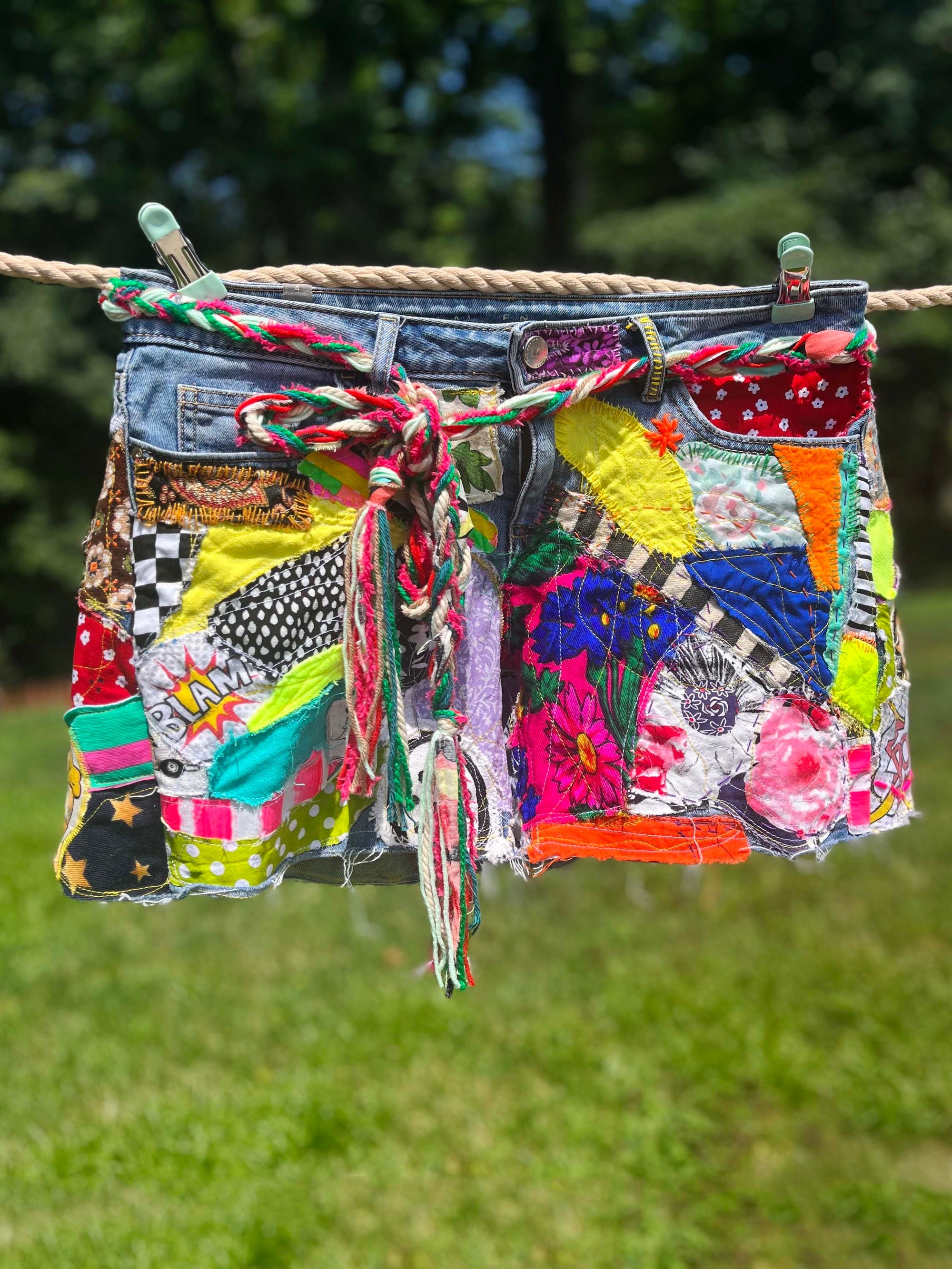 Say hello to your new favorite summer staple. These one-of-a-kind patchwork shorts are stitched together with a serious 1969 energy. Made from rare vintage fabrics, each pair is totally unique. With playful collages, applique, hand embroidery, this shorts are for those who are chasing that carefree, flower-child vibe.