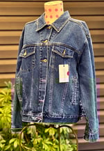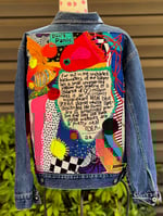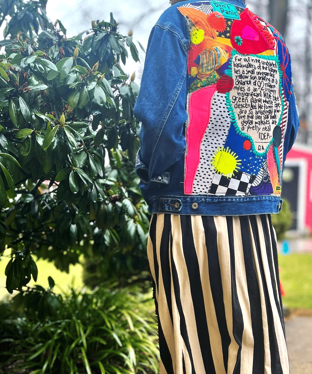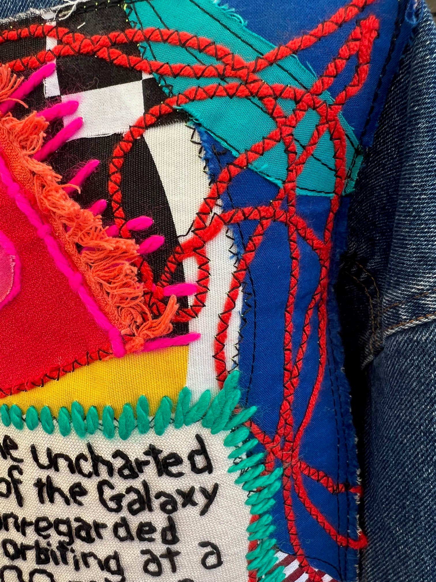 The Hitchhikers' Guide to the Galaxy Denim Jacket. Hand embroidered quote and details, fabric collage, upcycled cotton denim jacket.