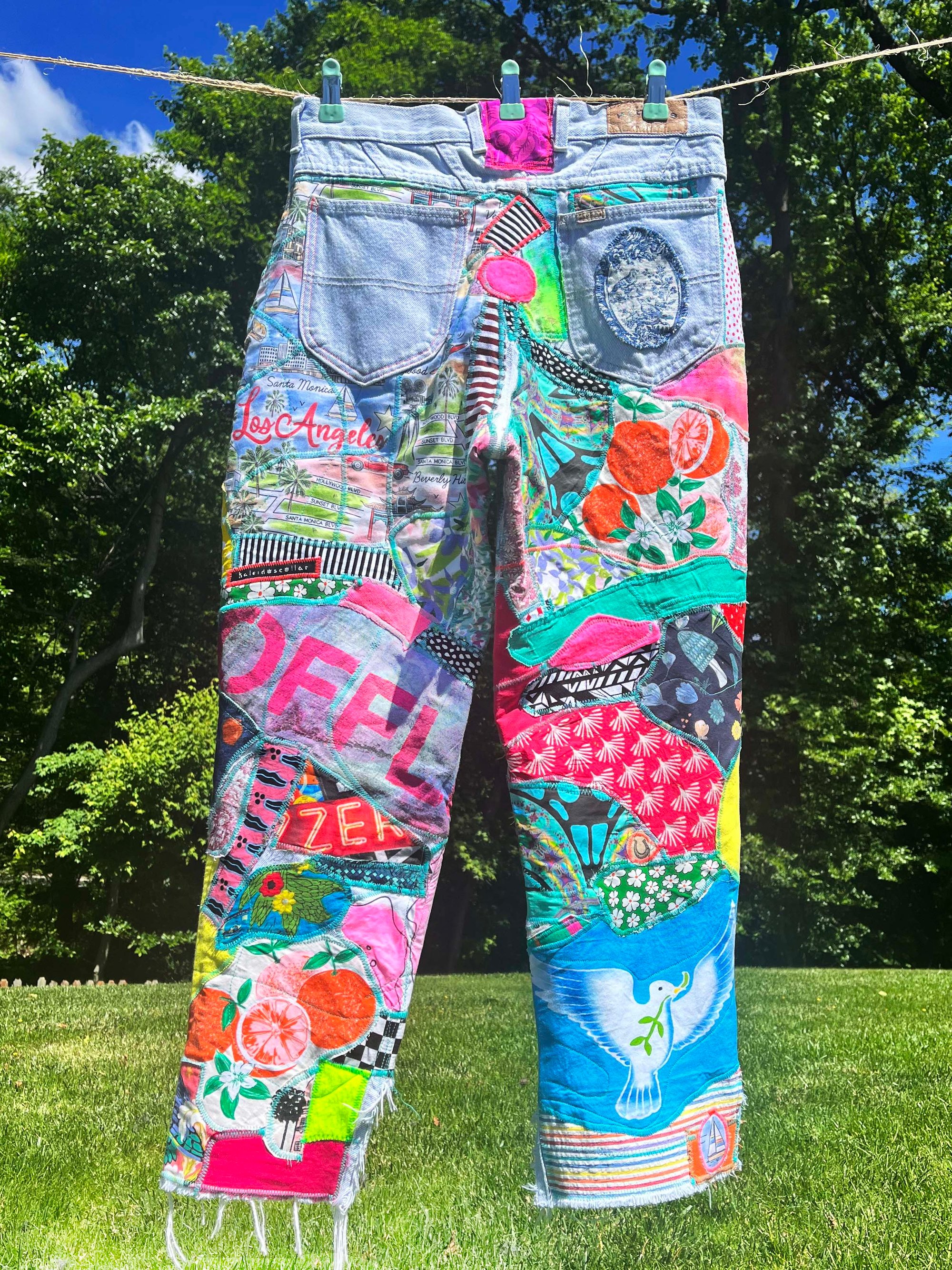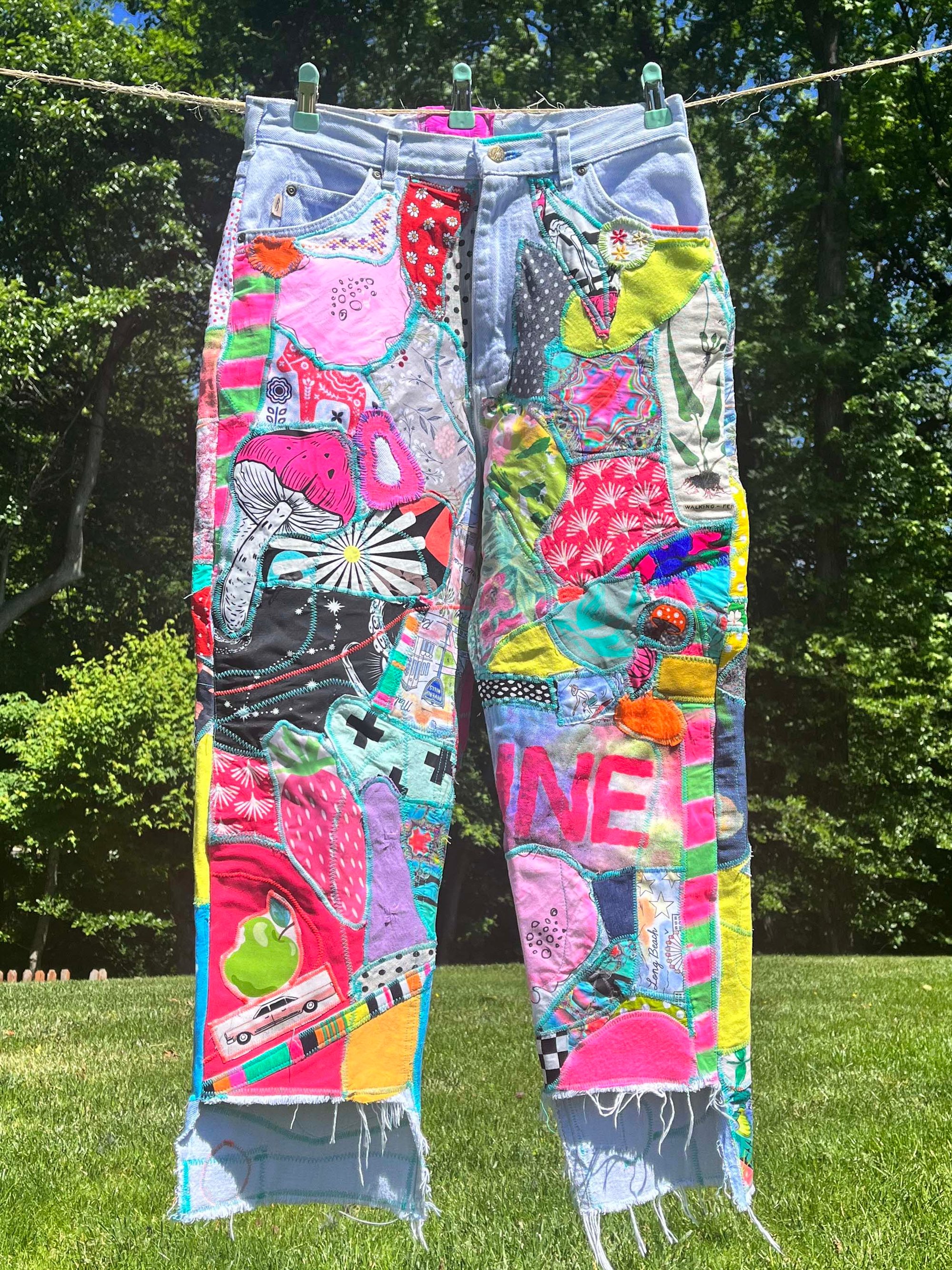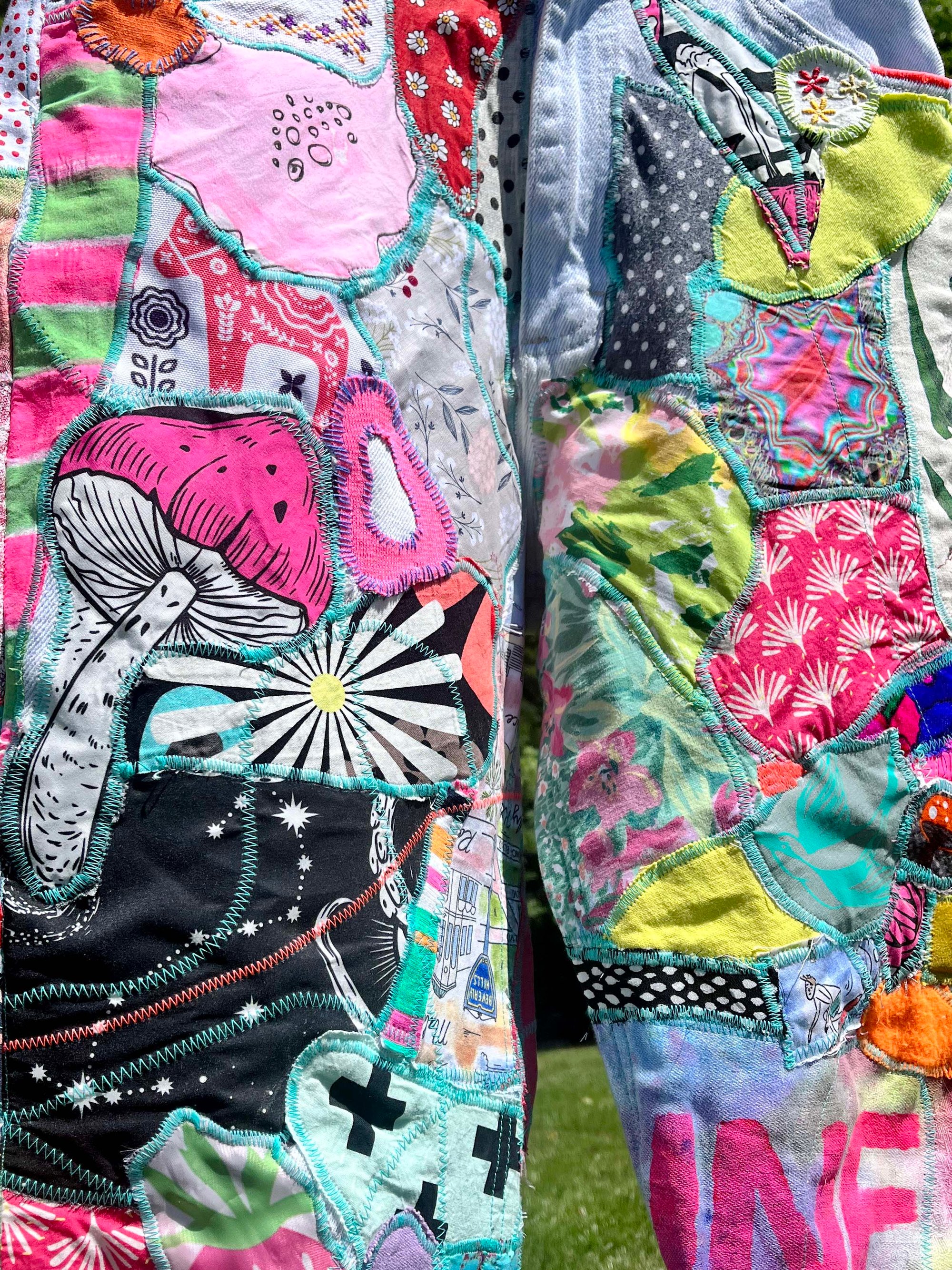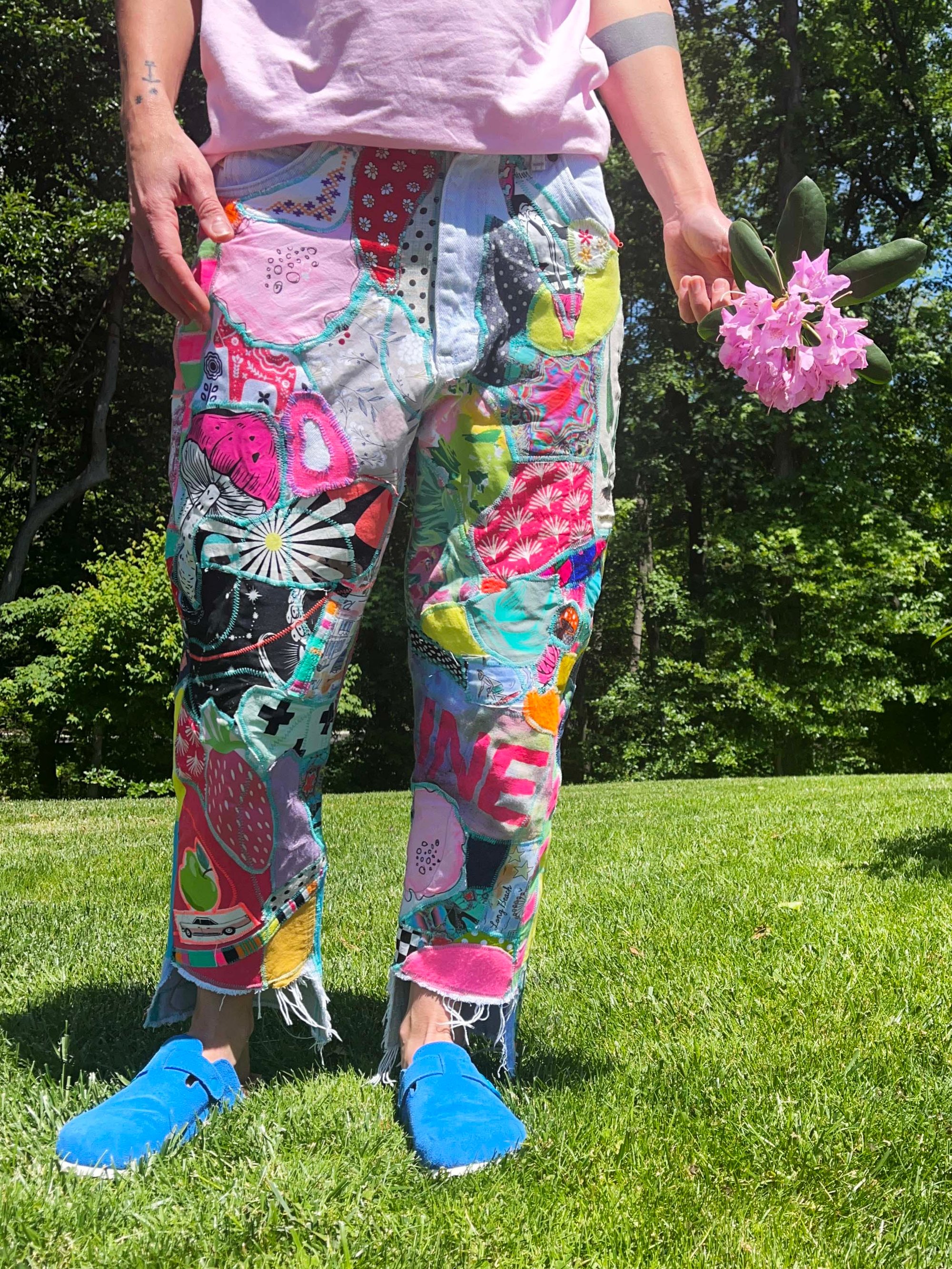 A rebellious handmade patchwork jeans, where freedom and creativity collide. Each pair is a raw, artistic expression, stitched together with a mix of vintage and modern fabrics that echo the spirit of the unconventional. Bright, bold, and unapologetically unique, these jeans are for those who reject the ordinary and live outside the lines. Crafted for dreamers, festival rebels, and lovers of the unknown.